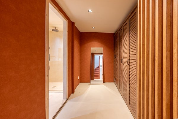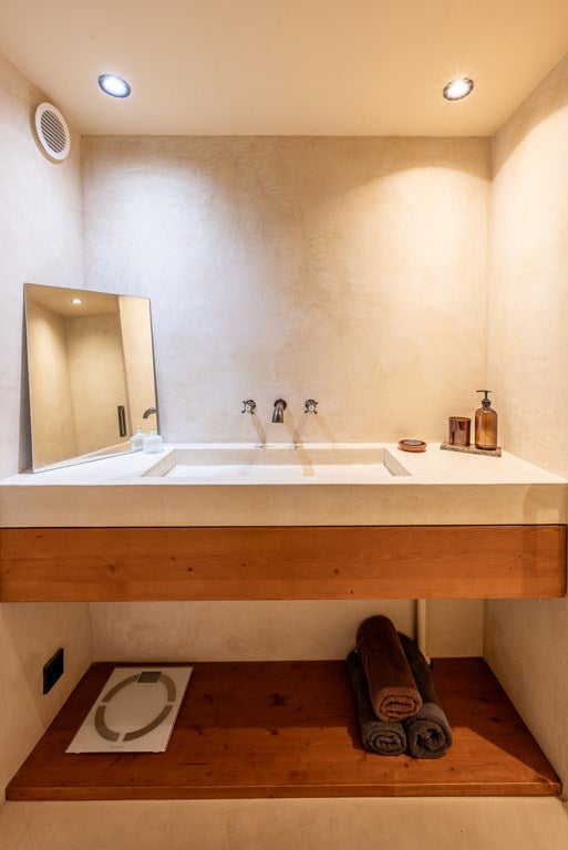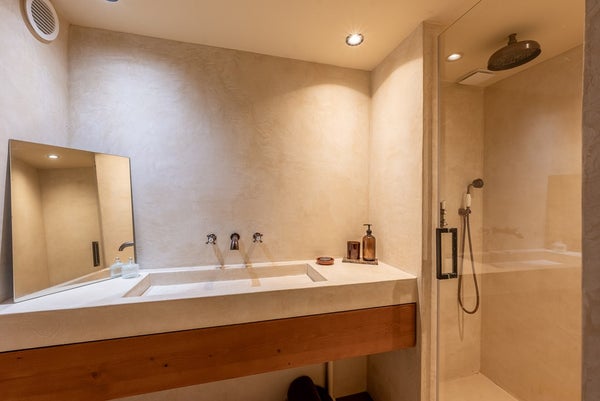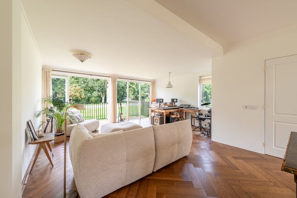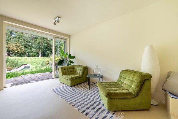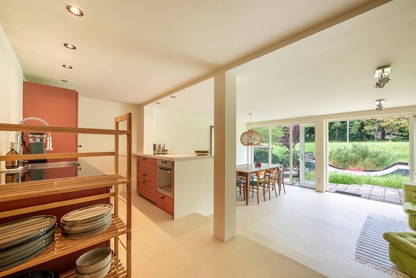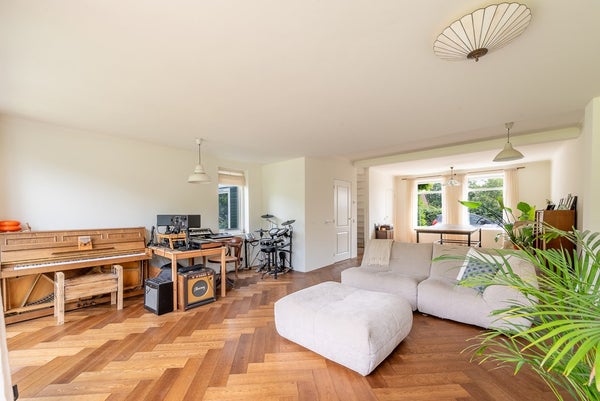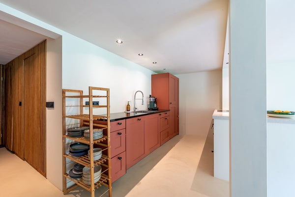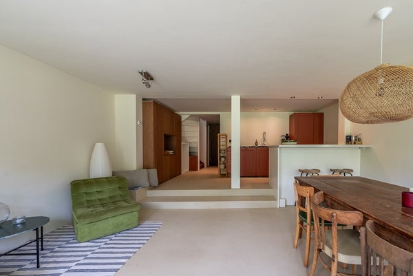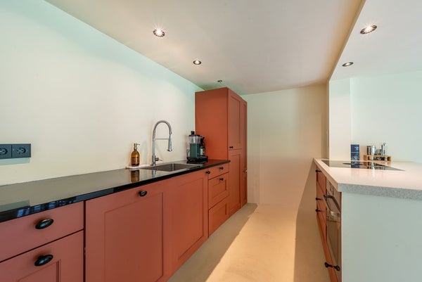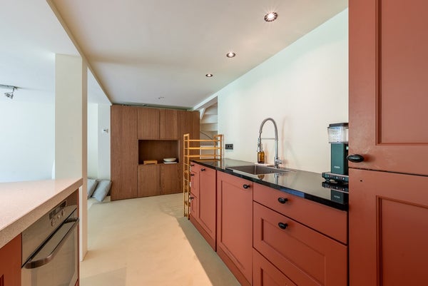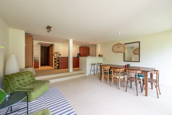 De luxe woonkeuken met bar is uitgerust met hoogwaardige inbouwapparatuur en biedt een prachtig uitzicht op de tuin aan het water. Een sfeervolle splitlevel dinerruimte en zithoek vormen de ideale plek om gasten te ontvangen en te entertainen tijdens het koken. Via de openslaande deuren bereikt u de ruime tuin van circa 110 m², waar u dankzij de omliggende laagbouw vrijwel de hele dag van de zon kunt genieten. De moderne badkamer, met een stijlvolle wastafel, regendouche en afwerking in beton ciré, vormt een elegant contrast met de warme, aardse tinten van deze etage.
