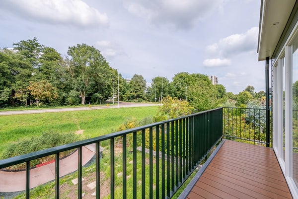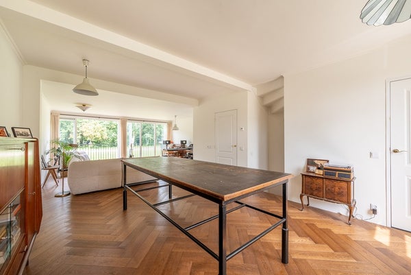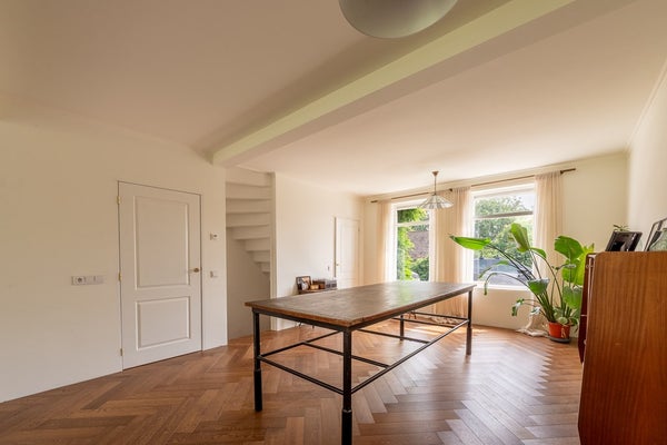 Bij binnenkomst op de tweede etage wordt u verwelkomd in de ruime doorzonwoonkamer, ingericht met een smaakvolle zithoek en een grote werktafel, ideaal voor thuiswerken of het ontvangen van gasten. Vanuit de woonkamer heeft u toegang tot een zonnig balkon. In de hal vindt u een apart toilet, afgewerkt met moderne, saliegroene tegels in Portugese stijl.