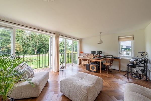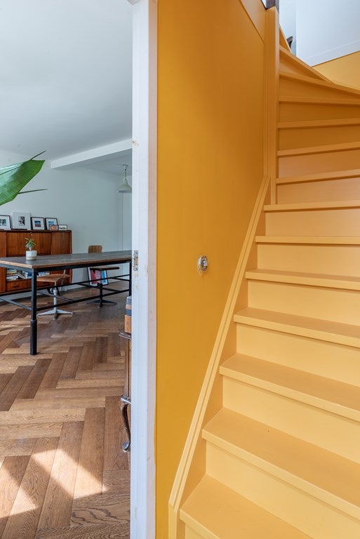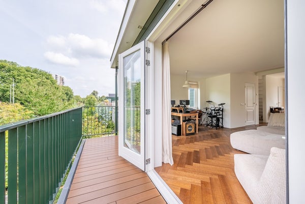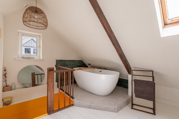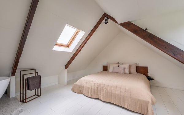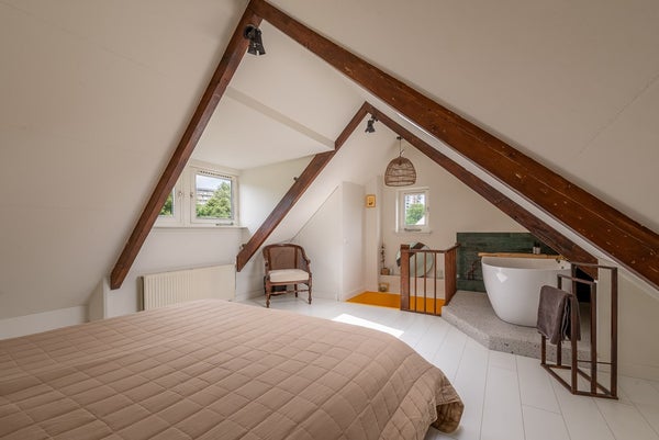 De derde etage is volledig ingericht als serene slaapverdieping. Grote raampartijen, originele houten balken en een vrijstaand ligbad creëren een rustgevende sfeer, ideaal om te ontspannen na een drukke dag.