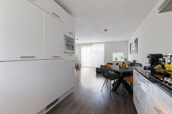 De halfopen keuken is modern uitgevoerd, volledig voorzien van inbouwapparatuur en beschikt over alle benodigde voorzieningen, waaronder een kookplaat, oven, vaatwasser, koel-/vriescombinatie en voldoende kastruimte. De praktische indeling maakt de keuken zowel functioneel als gezellig.