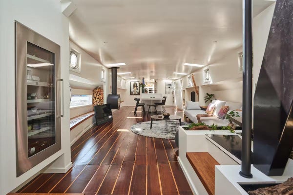 Gelegen in het centrum van Amsterdam, is deze nieuw gerenoveerde luxe huisboot uitgerust met de nieuwste technologie en gemeubileerd met designmerken.