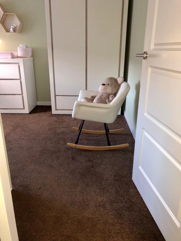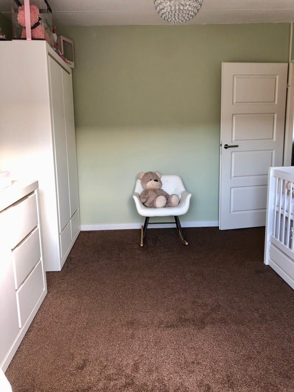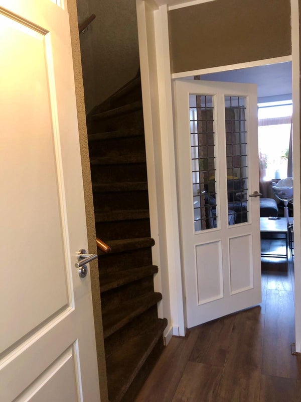 Terug in de hal gaan we via de trap naar de 1e verdieping die is voorzien van een vloerbedekking.