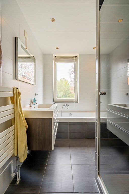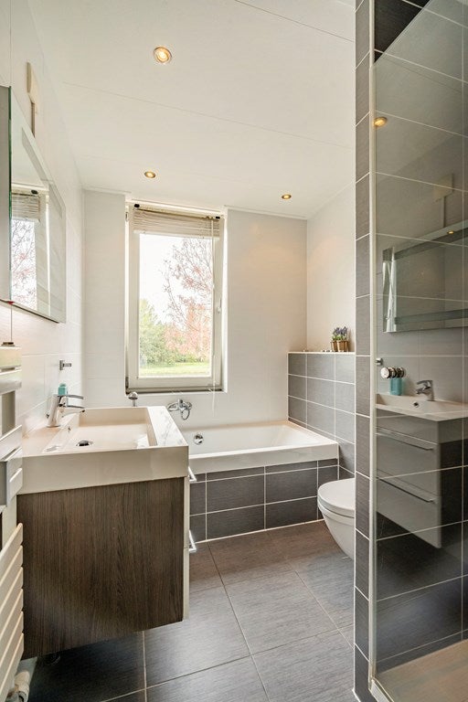 Eerste verdieping Overloop en drie slaapkamers, waarvan een grote master bedroom met uitzicht op het water. Luxe badkamer met ligbad, douchecabine, tweede toilet en wastafelmeubel.