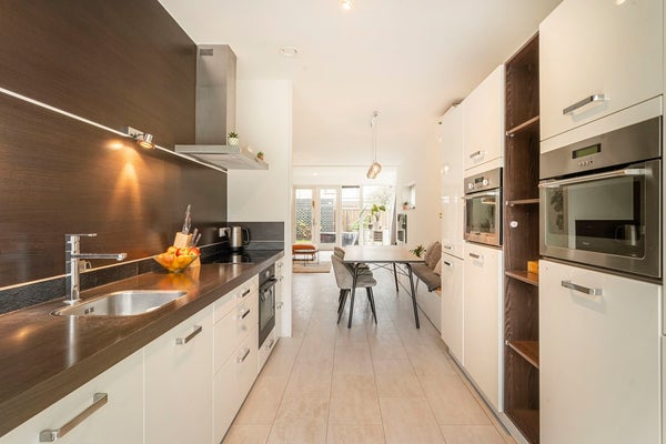 Begane grond Entree met hal, meterkast, trapkast en modern toilet. Ruime, lichte woonkamer met dubbele openslaande deuren naar de tuin. Luxe open keuken aan de voorzijde met o.a. vaatwasser, inductiekookplaat, combi-oven, magnetron, koelkast, vriezer en volop bergruimte
