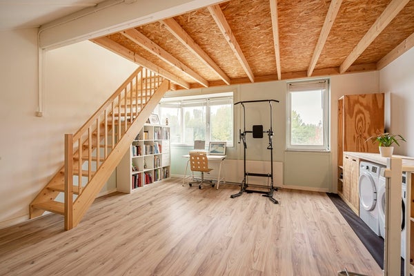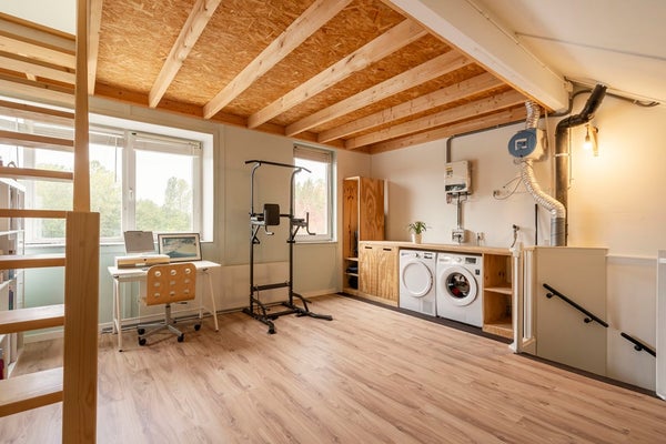 Tweede verdieping Grote open ruimte met mogelijkheden voor een werkkamer of hobbyruimte. Aansluitingen voor wasmachine en droger.
