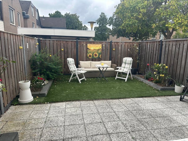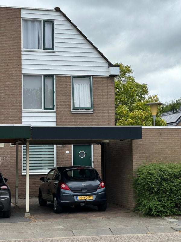 De ruime voortuin op het westen is voorzien van een carport en berging, perfect voor fiets- en opslagruimte.
