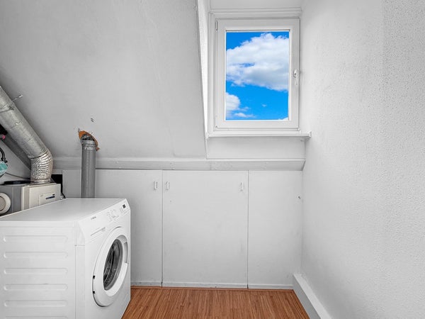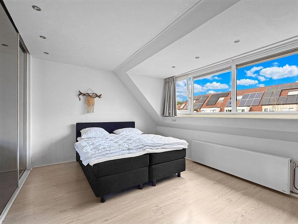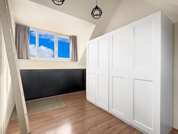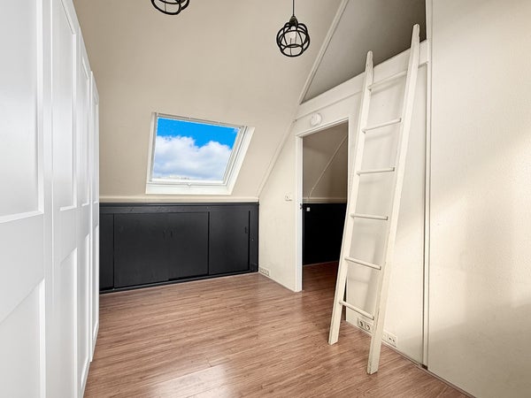 Derde slaapkamer of werkkamer met dakraam en extra bergruimte.