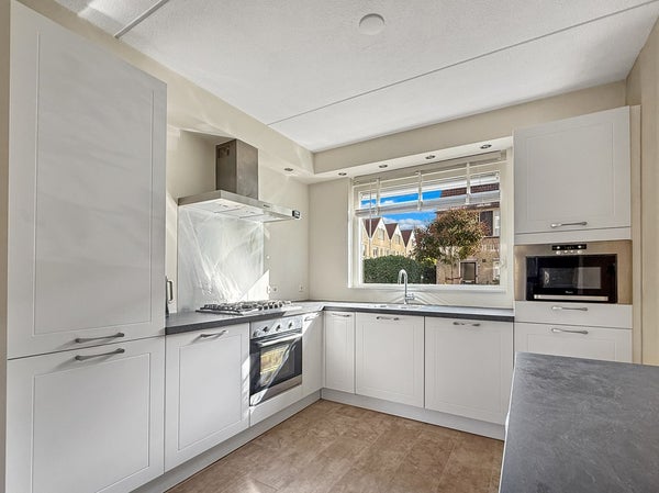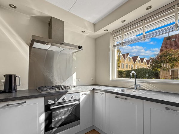 Entree, hal met separaat toilet, lichte woonkamer met grote raampartijen en toegang tot de zonnige tuin. De open keuken is voorzien van moderne inbouwapparatuur en biedt voldoende kastruimte.