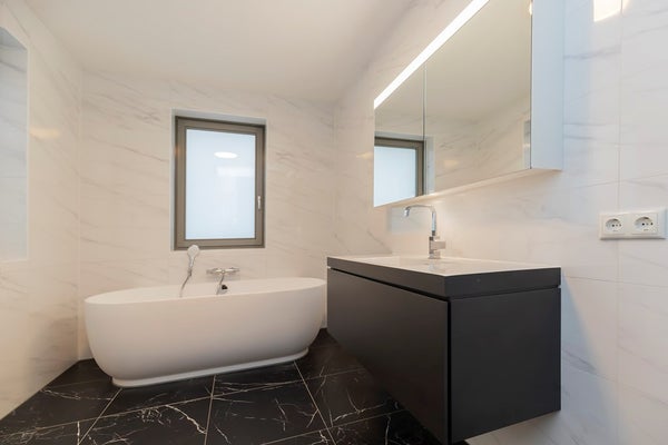 Badkamer: tussen slaapkamer 2 en 3 op de overloop bevindt zich de tweede badkamer. Deze is voorzien van een groot bad, inloopdouche en wastafel.