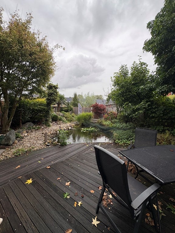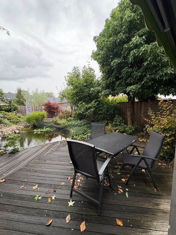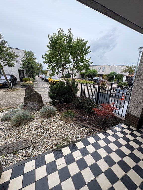 De achtertuin is verrassend royaal, met een breed terras van houten vlonders, een riante vijver en veel groen. Dankzij de diepte van de tuin blijft er ook na een eventuele uitbouw voldoende buitenruimte over. Vanuit de tuin is de garage bereikbaar en deze beschikt over een elektrisch bedienbare deur. De garage is eveneens vanaf de voorzijde bereikbaar. Voor de garage kan de auto op eigen terrein worden geparkeerd.