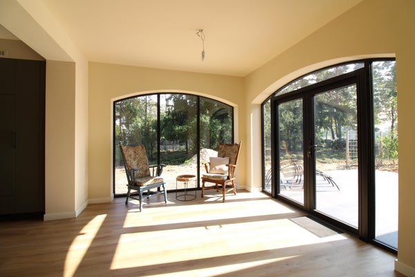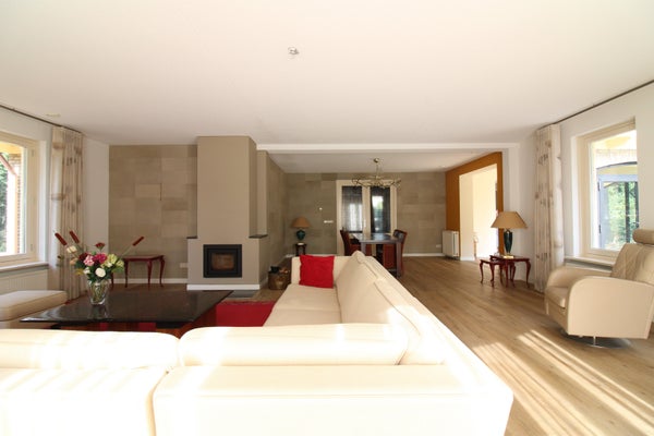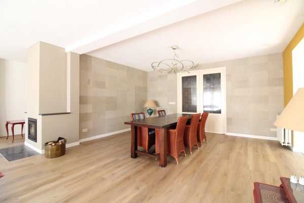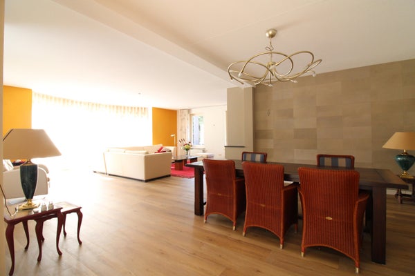 Royale woonkamer in Z-vorm en omring door beraming voor veel natuurlijke lichtinvalt. Er zijn diverse mogelijkheden om zit- of eethoeken te creëren, en ook hebt u toegang tot de keuken vanuit de woonkamer.