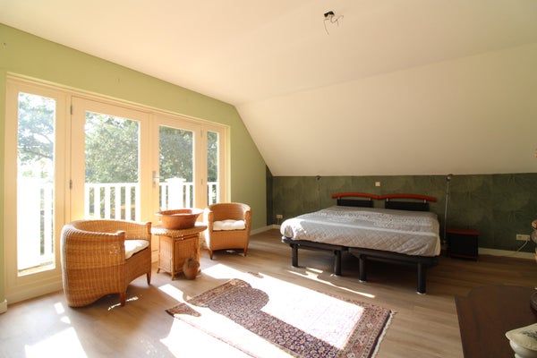 De ouderslaapkamer strekt over de breedte van de woning en is eventueel af te sluiten. Deze kamer heeft een en-suite badkamer met daar een inloopdouche, dubbele wastafel met ombouw en een toilet. Vanuit de slaapkamer zelf kijkt u rustgevend weg over de omringende tuin.