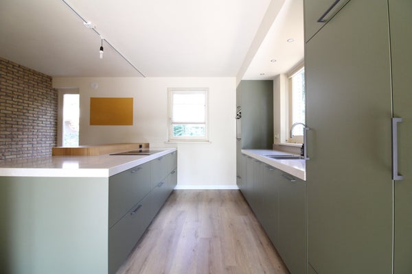 Deze keuken is modern ingericht, en beschikt over diverse inbouwapparatuur, waaronder een koelkast, kookeiland met 4-pits inductiekookplaat met geintegreerd afzuigsysteem, een vaatwasser, oven en een quooker kraan. Vanuit de keuken hebt u een uitzicht over de achtertuin.