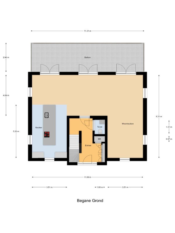 Entree, toiletruimte, garderobe, ruime, lichte woonkamer welke toegang geeft tot het balkon en een prachtige luxe keuken welke voorzien is van alle mogelijke gemakken.