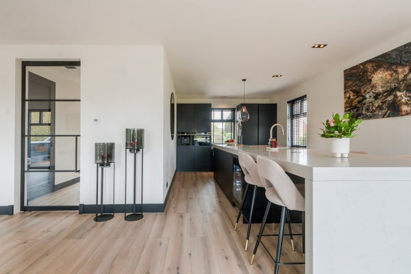 Open keuken in lichte kleurstelling welke voorzien is van diverse inbouwapparatuur zoals; koelkast, vrieskast, afzuigkap, vaatwasser, oven, magnetron en kookplaat en wijnklimaatkast!