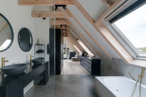 Badkamer is voorzien van een ruim ligbad, inloopdouche en wastafel.