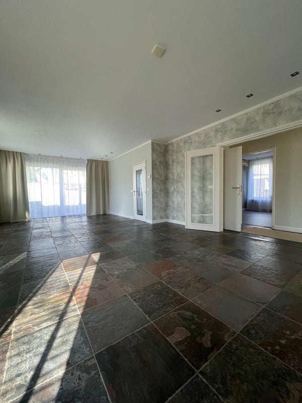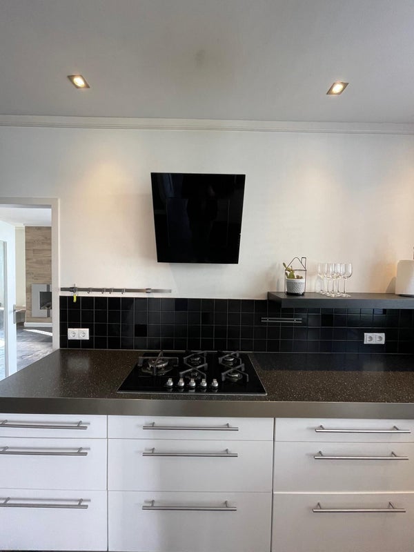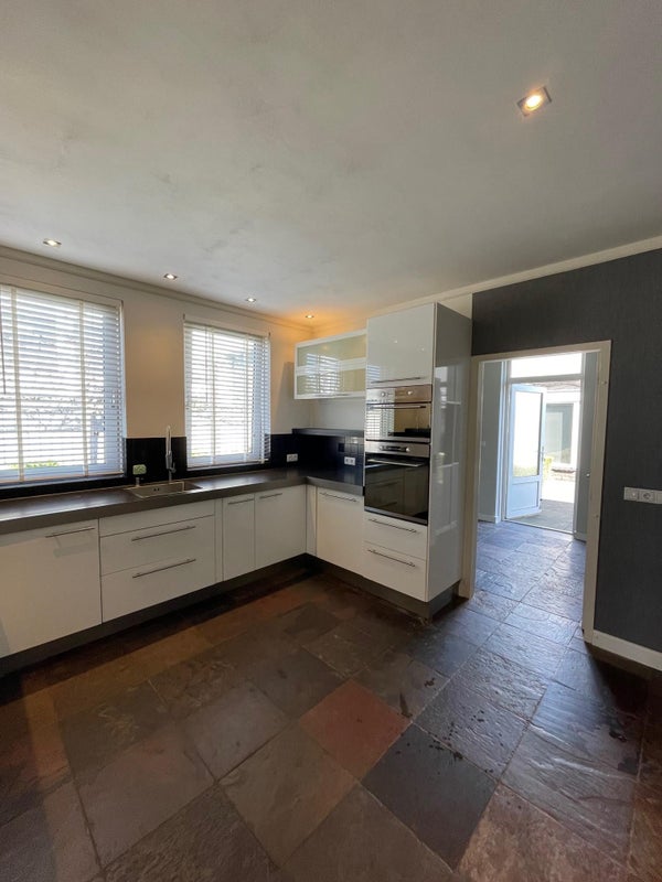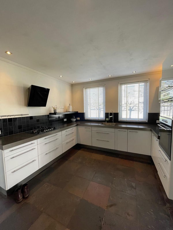 De vele raampartijen en schuifdeuren naar de tuin zorgen voor volop lichtinval waardoor de ruimtes en zeker de woonkamer erg licht zijn. Aansluitend aan de woonkamer is de keuken bereikbaar. Deze moderne keuken van 15m2 is voorzien van enorm veel opbergruimte, (inbouw) apparatuur: een groot 5-pits gasfornuis met design afzuigkap, oven, magnetron en vaatwasser. Via de keuken bereikt u de ruime bijkeuken met inbouwkasten voor de wasmachine en droger.