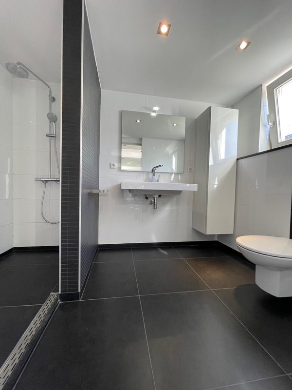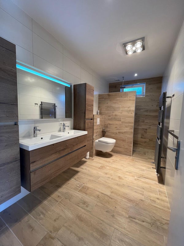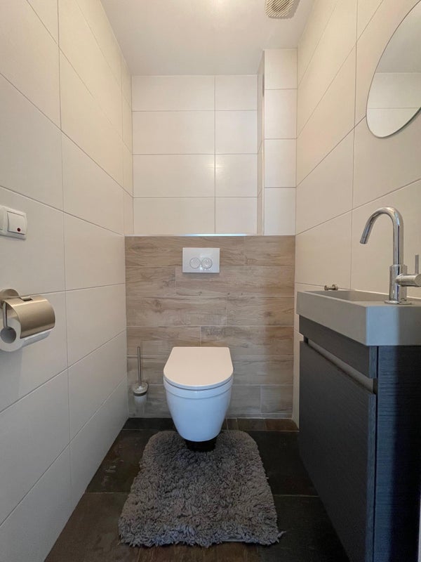 De toiletruimte is voorzien van een closet en een fonteintje. De gehele woning heeft een nieuwe tegelvloer met vloerverwarming. Zo ook de ruime badkamer met grote inloopdouche, dubbele wasbak en toilet.