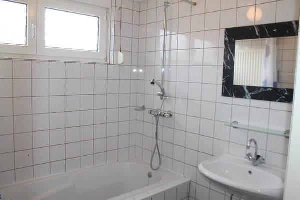 Geheel betegelde badkamer (1.95 x 1.85) met tegelvloer, wastafel en ligbad.