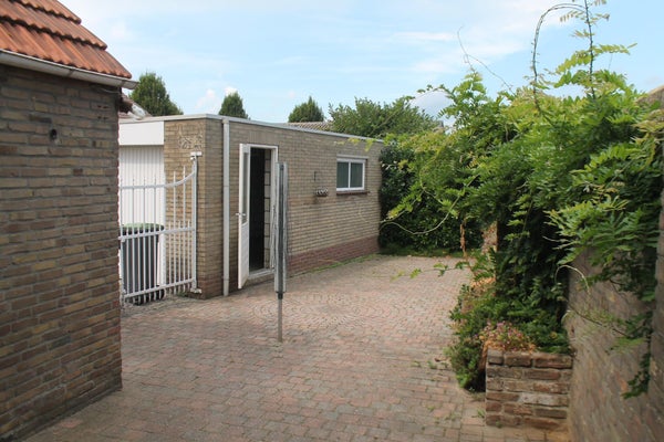 Geheel betegelde tuin welke ook bereikbaar is via de oprit.