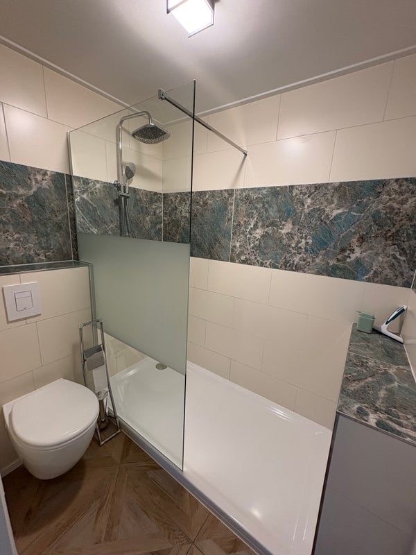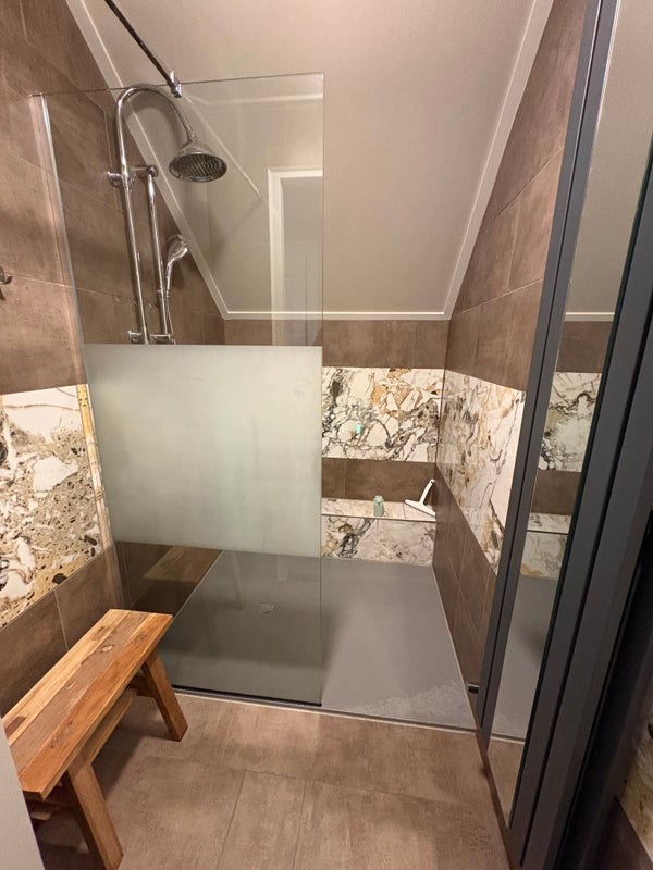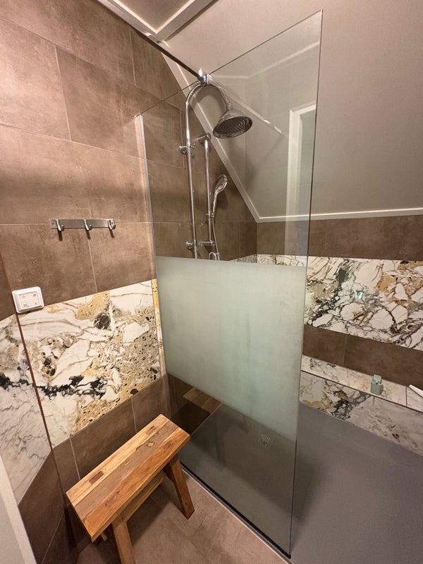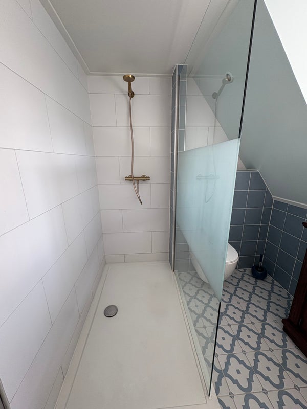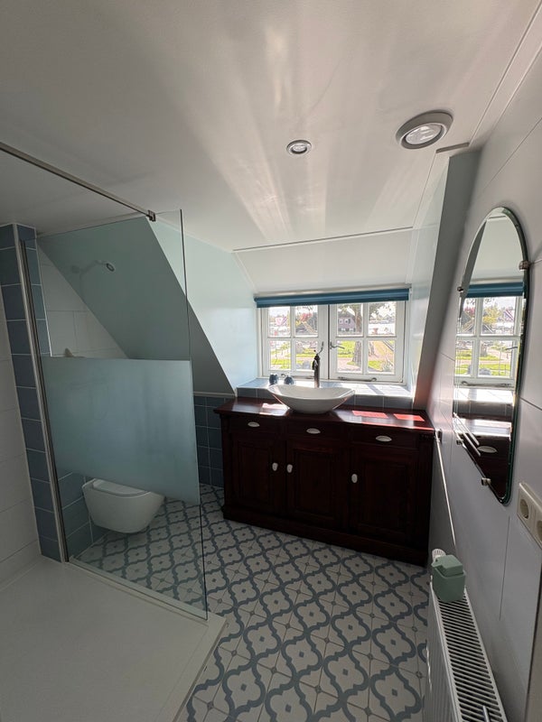 Twee ruime slaapkamers (ca. 16 m²) elk met wastafel, extra toilet en een royale badkamer met douche.