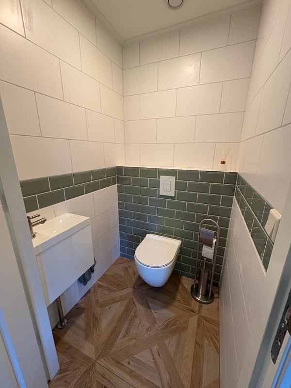 Eén slaapkamer met wastafel en toilet, plus aparte wasruimte met wasmachine en droger.