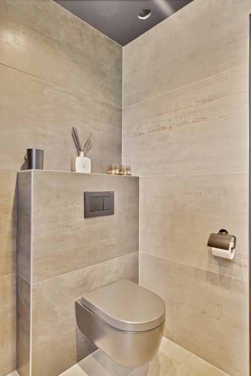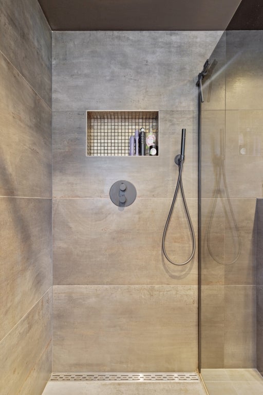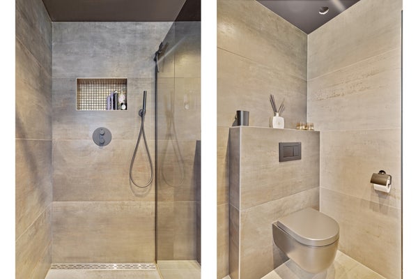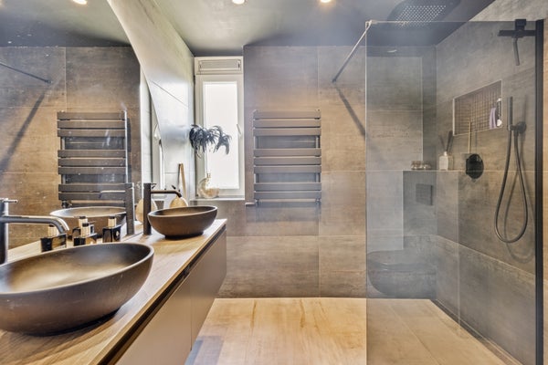 De badkamer is een echte eyecatcher, uitgevoerd in een hotel chique stijl. Geniet van het comfort van twee ronde waskommen met kranen, een stijlvol wastafelmeubel, een inloopdouche met glazen wand, een designradiator en een tweede toilet.
