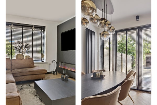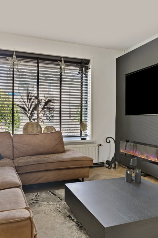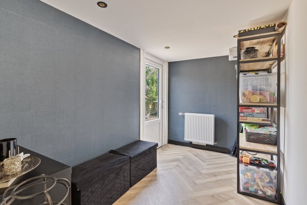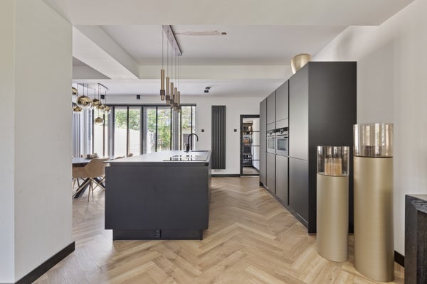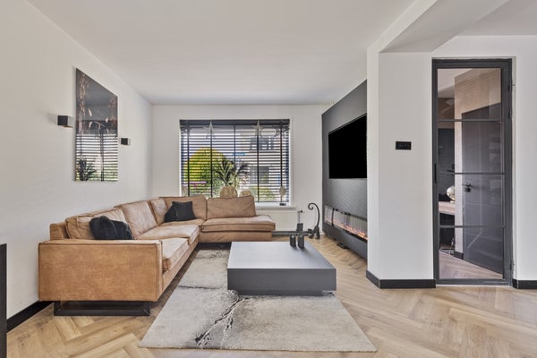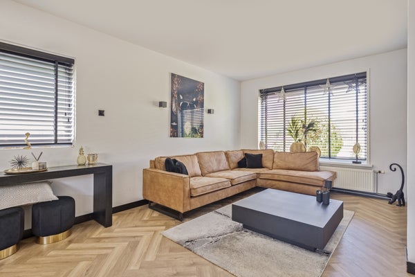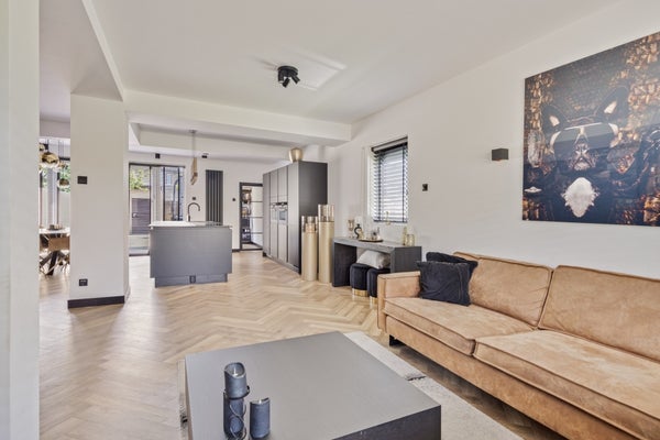 De sfeervolle woonkamer is zo ingericht dat je je direct thuis voelt. De ramen zorgen voor een prachtig uitzicht op de voortuin en laten veel natuurlijk licht binnen. De schitterende visgraatvloer voegt extra karakter toe aan de ruimte. Vanuit de woonkamer loop je naadloos door naar de ruime open keuken en het eetgedeelte.