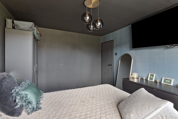 De eerste slaapkamer is een ruime kamer met een tweepersoonsbed, kledingkast en flatscreen-tv.