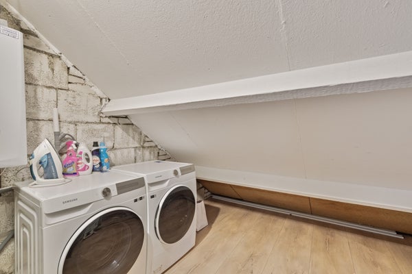 Op de tweede etage vind je praktische faciliteiten zoals een wasmachine en droger, evenals de vierde slaapkamer.