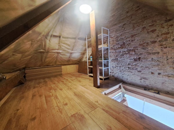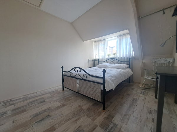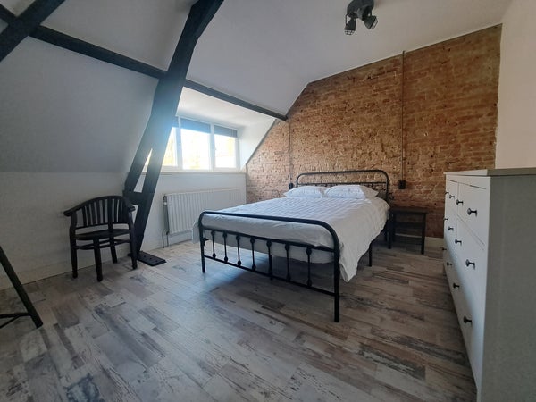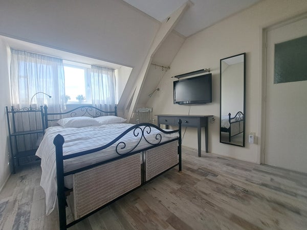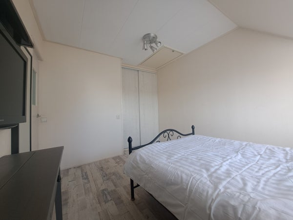 De tweede slaapkamer is eveneens voorzien van een tweepersoonsbed, een tv, spiegel en inbouwkasten. Vanuit deze kamer is de zolder bereikbaar, met extra opbergruimte.