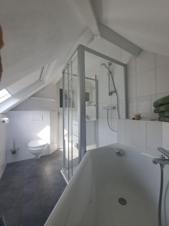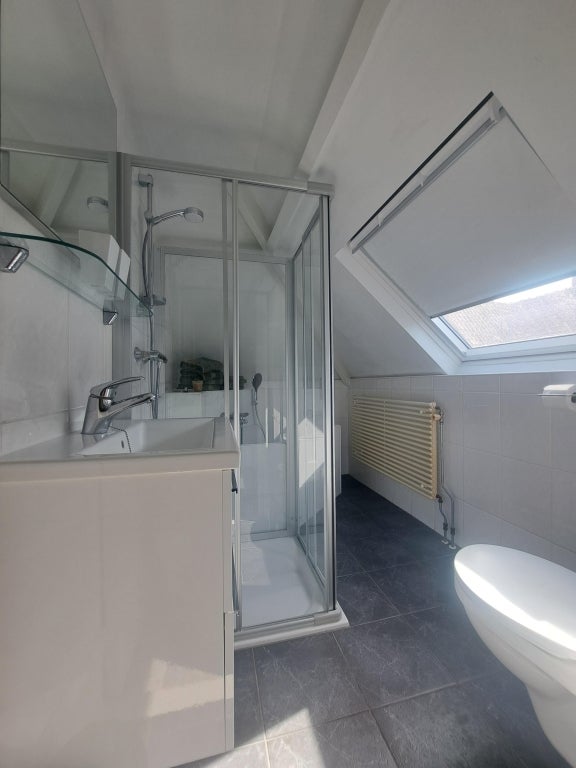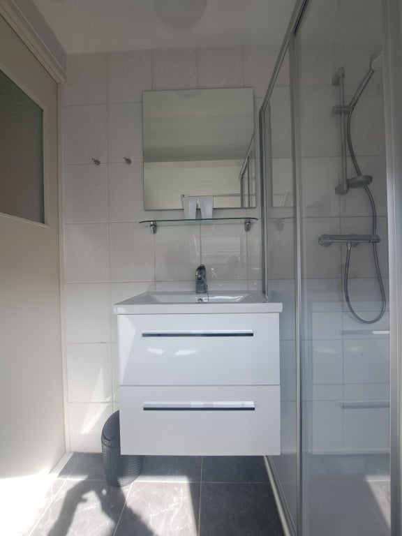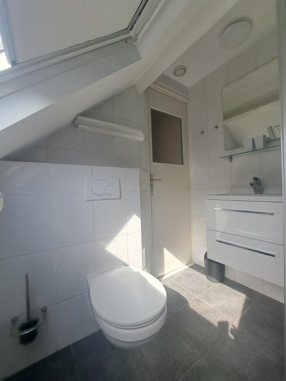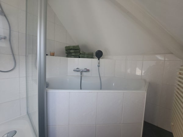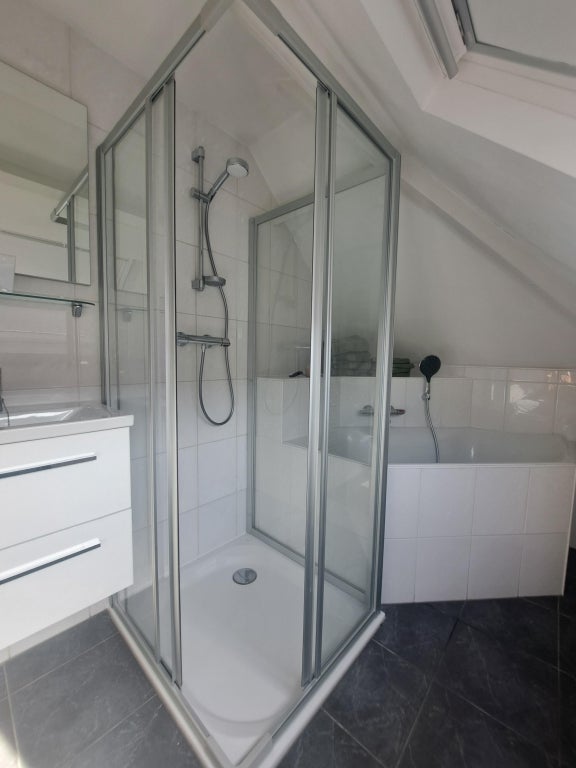 De badkamer is praktisch en compleet, voorzien van een douchecabine, een badkuip, een wastafel met meubel en een toilet.