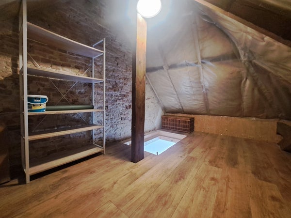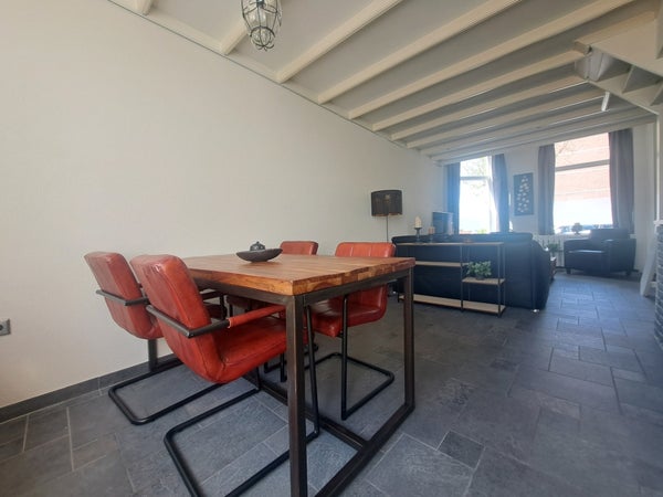Bij binnenkomst valt direct de warme sfeer op, mede door de stenen vloer en de authentieke houten balken. De open indeling zorgt voor een natuurlijke overgang tussen de leefruimtes. De zithoek is uitgerust met een comfortabele 2,5-zitsbank, twee fauteuils, een salontafel en een tv-meubel. Aangrenzend bevindt zich de eethoek met plaats voor vier personen.