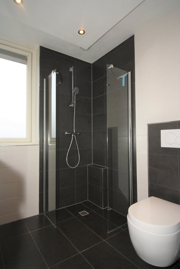 De badkamer is heeft een moderne uitstraling en beschikt over een inloopdouche met thermostatische douchekraan, wasmeubel met wastafel en mengkraan, toilet en designradiator.
