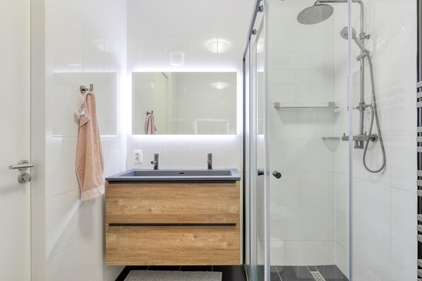 De moderne badkamer is voorzien van een ruime douchecabine met regeldouche, een 2e toilet, handdoekradiator en dubbele wastafel met meubel en een LED spiegel.