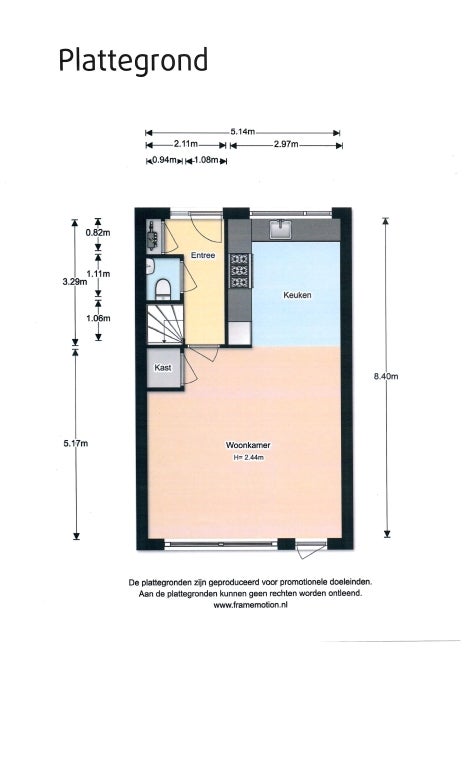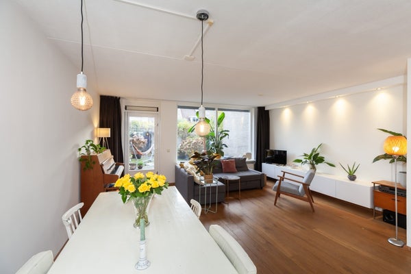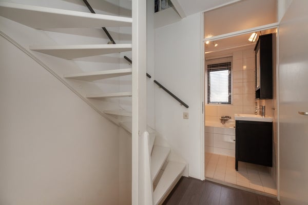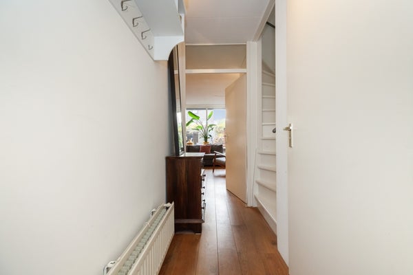 Entree, hal met toilet en trapopgang. Er is een lichte woonkamer v.v. eiken houten vloer met zicht op de achtertuin. In de woonkamer is ook een trapkast met veel bergruimte.