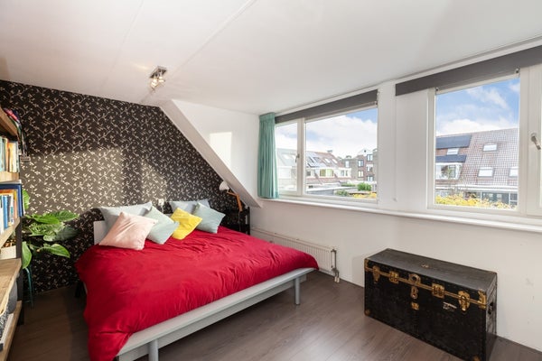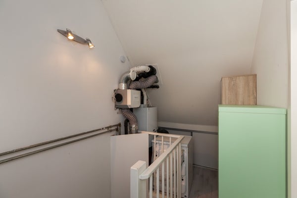 Overloop met bergruimte, dakraam, CV-opstelplaats en de wasmachine. De slaapkamer (10 m2) op deze verdieping wordt niet mee verhuurd.