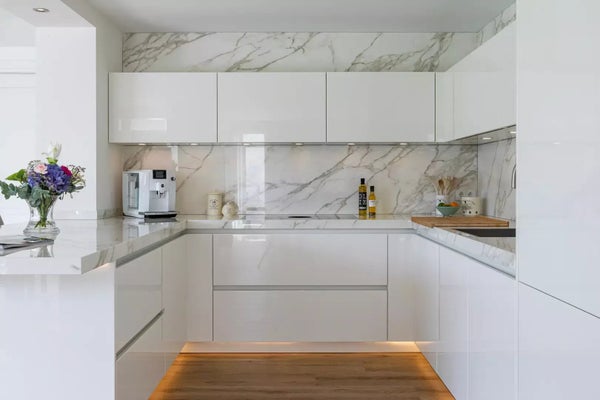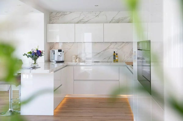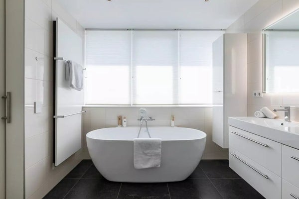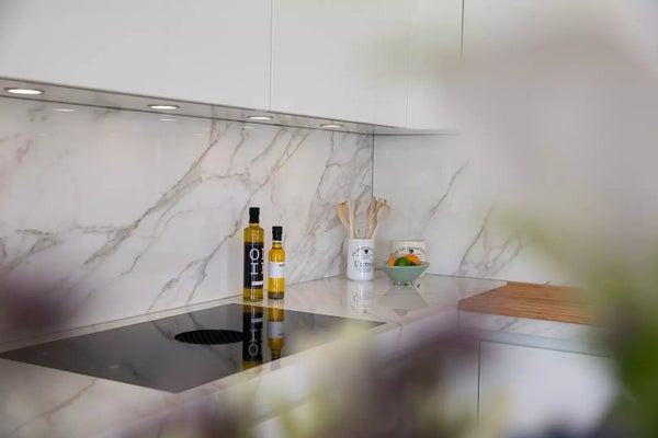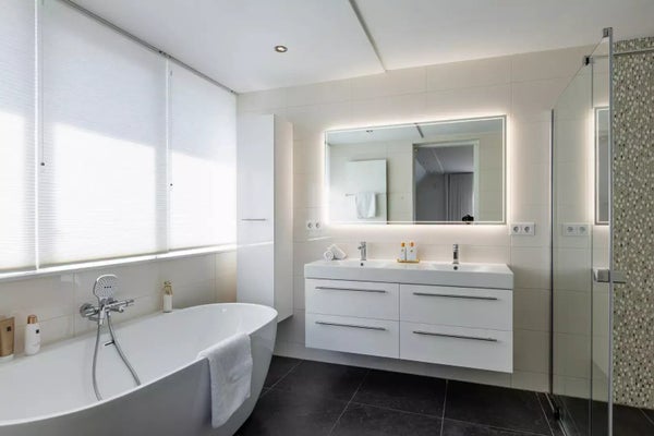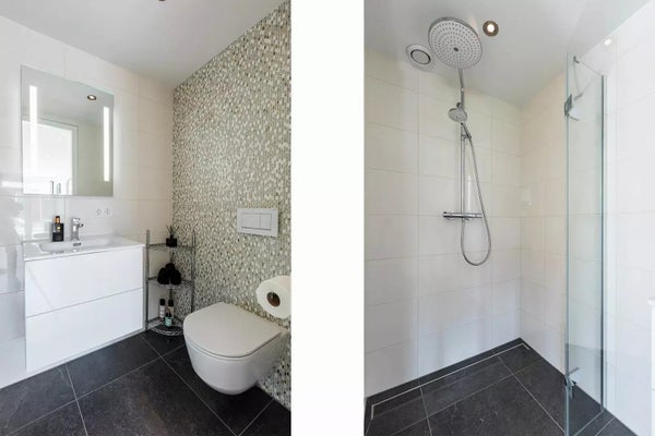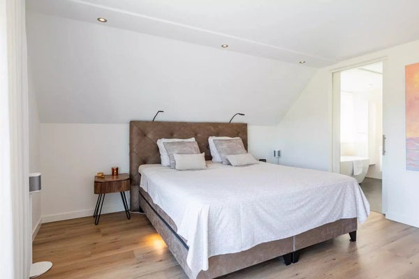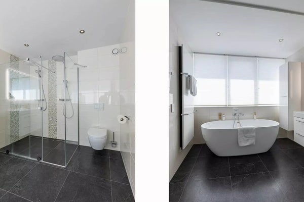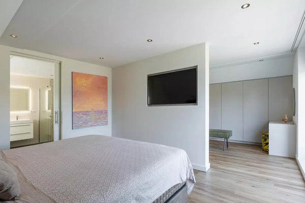 Drie ruime slaapkamers, waaronder een luxe masterbedroom met inloopkasten, balkon en ensuite badkamer met dubbele inloopdouche. Tweede badkamer met douche, wastafel en toilet.