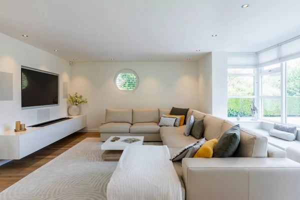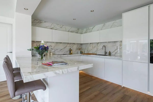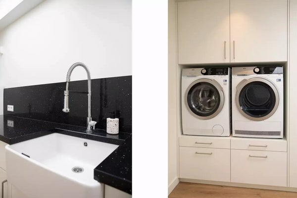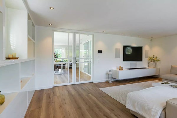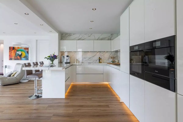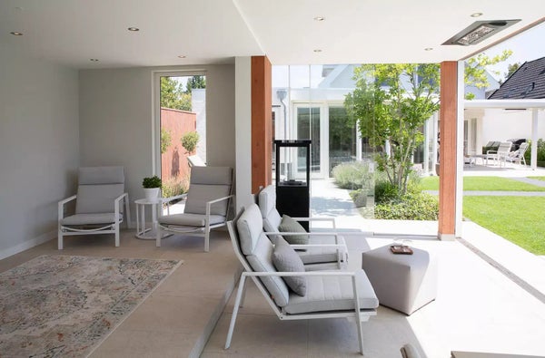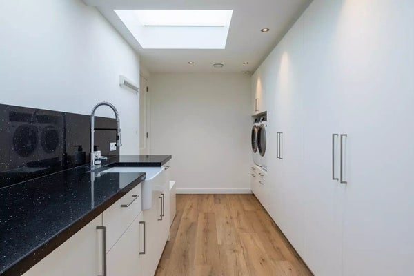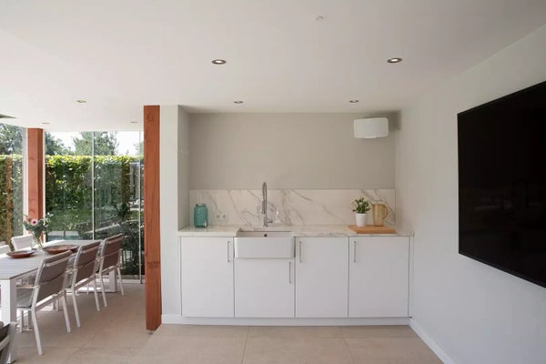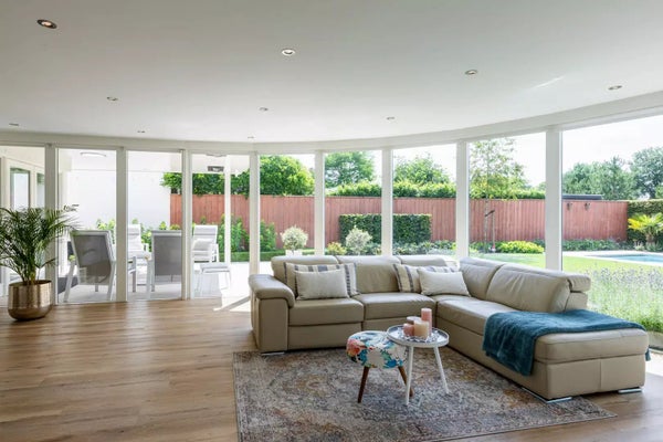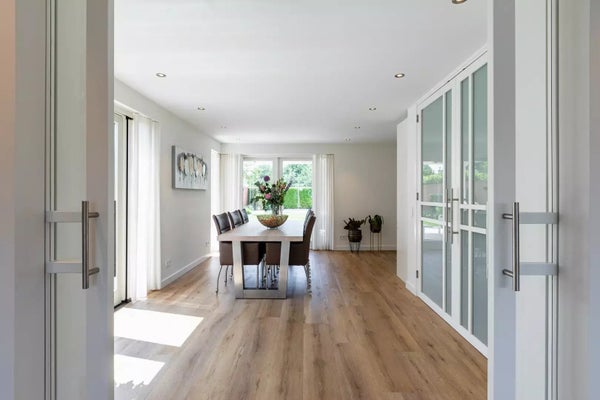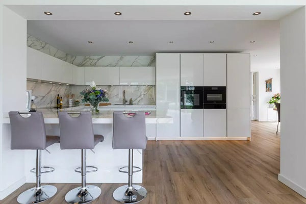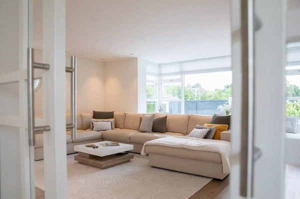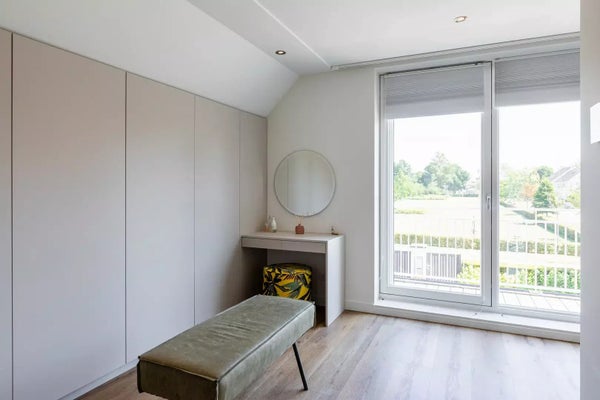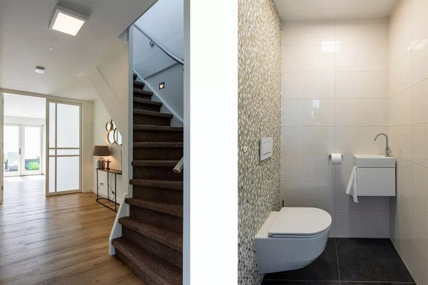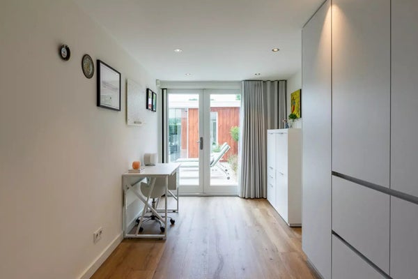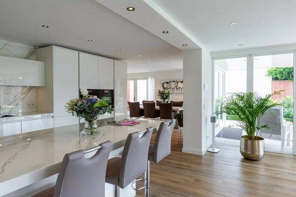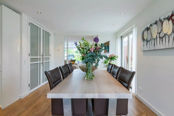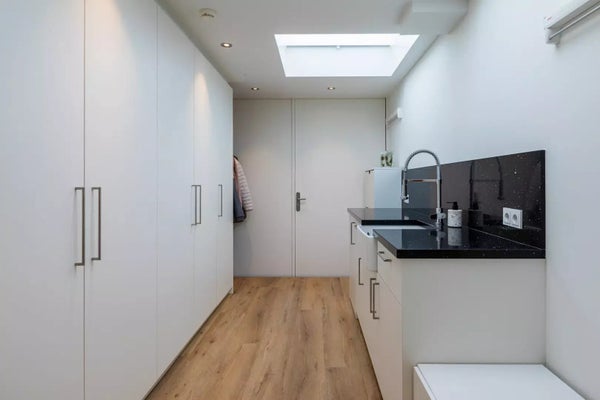 Royale hal met moderne afwerking en domoticasysteem. Ruime woonkamer met cinemaroom, luxe leefkeuken met kookeiland en topapparatuur (Bora, Miele, Quooker). Aangrenzende serre en praktische bijkeuken. Daarnaast een multifunctionele kamer met eigen badkamer (ideaal als werk-/slaapkamer).