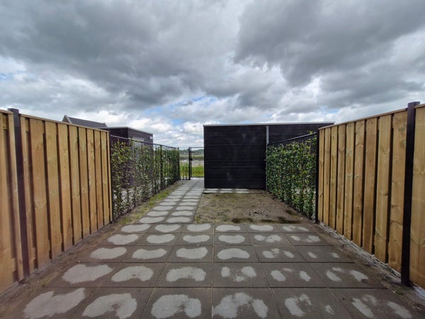- Tuin gelegen op het noorden met straatwerk (deels), berging (6m2), erfafscheiding en loopdeur naar achtergelegen parkeerterrein.