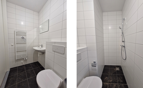 - Badkamer met toilet, vaste wastafel met spiegel en inloopdouche;
