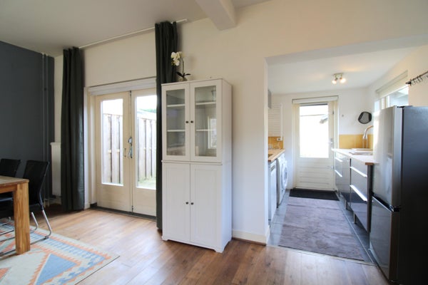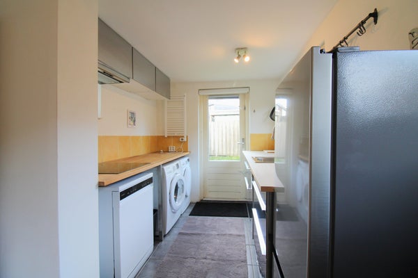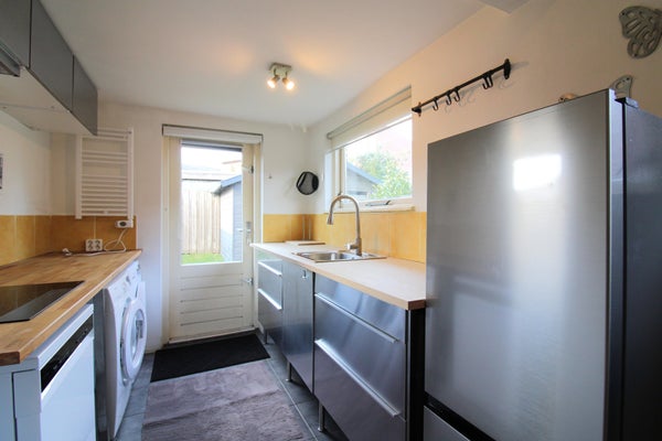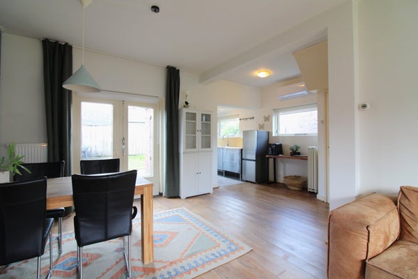 Gezellige woonkamer uitgerust met een houten vloer en volledig inrichting. Er is een airco installatie gerealiseerd aan de wand welke kan koelen en verwarmen. Aangesloten treft u de half-open keuken, bestaande uit een werkblad aan beide zijden, koel-vries combinatie, vaatwasser, inductiekookplaat en bergruimte. Ook zijn de wasmachine en droger hier te vinden.
