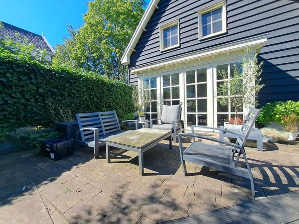 Buiten krijg je het gevoel alsof je op een boot zit met het water om je heen. Er is een groot terras aan de zijkant aangelegd waar ook de tuinstoelen al op je staan te wachten.