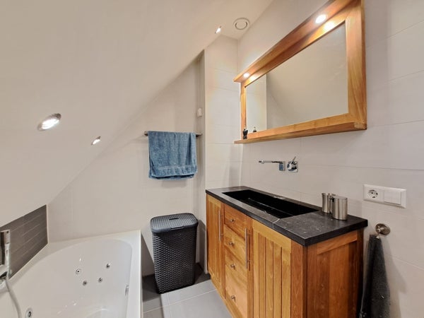 Via de overloop is ook de tweede slaapkamer, voorzien van een 1 persoons bed, en de badkamer bereikbaar. De badkamer heeft zowel een bubbelbad, 2de toilet en een aparte inloop douche. De moderne wastafel met grote spiegel maakt het plaatje helemaal compleet.