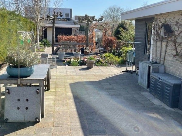 De tuin is een ware eyecatcher: gelegen op het westen, dus je profiteert hier volop van de middag- en avondzon. De tuin is onderhoudsvriendelijk aangelegd met grote terrastegels, vaste plantenbakken, een houten berging en een achterom. Door de vrije ligging aan de zijkant voelt het extra ruim aan.