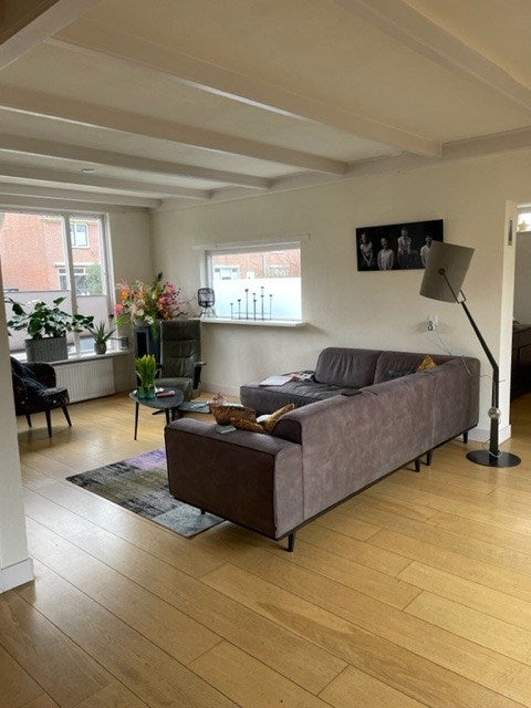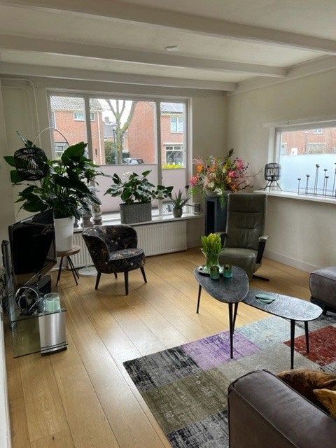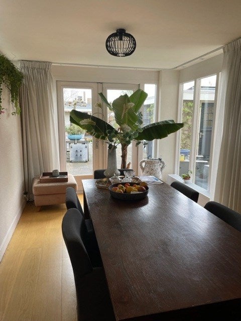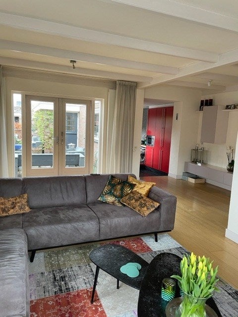 De lichte en ruime woonkamer heeft een gezellige indeling en is voorzien van een houten vloer, strak gestuukte wanden en grote ramen aan zowel de voor- als achterkant. Aan de achterzijde vind je de royale eethoek in de uitbouw, omringd door ramen en openslaande deuren naar de tuin – ideaal voor lange avonden tafelen of een gezellige borrel.