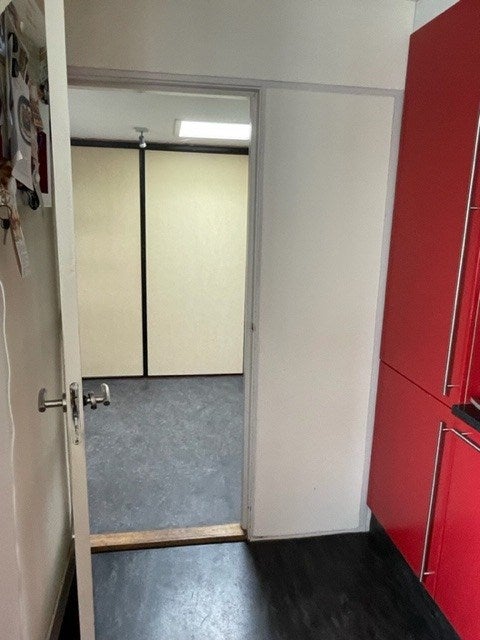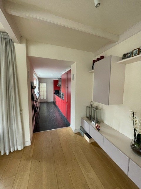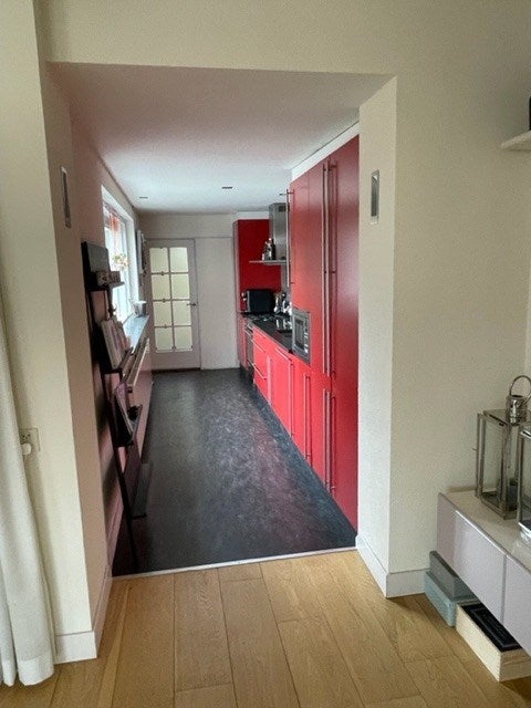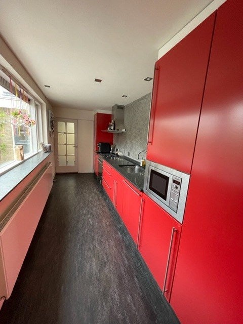 De keuken is opvallend dankzij de rode kleurstelling en moderne apparatuur. Je hebt hier onder andere een ingebouwde combimagnetron, oven, vaatwasser, gaskookplaat en voldoende kastruimte. Vanuit de keuken kijk je uit op de achtertuin.