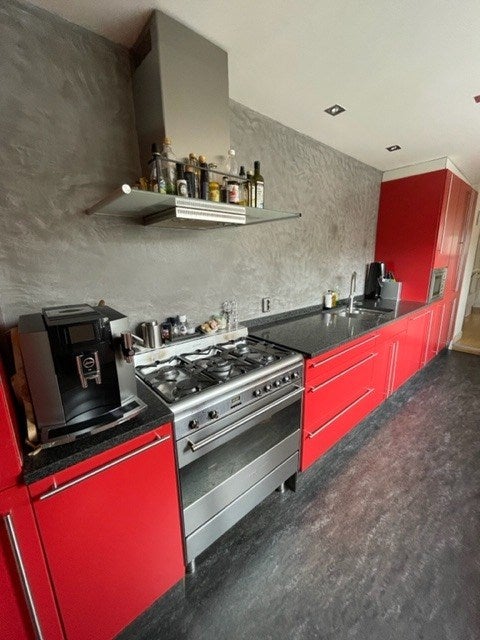 - Moderne keuken met inbouwapparatuur en opvallend rood design