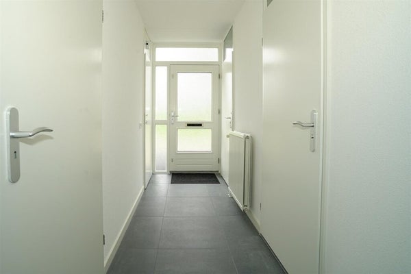 Via het paadje in de voortuin kom je bij de voordeur van deze instapklare woning. In de hal zijn de deuren naar de meterkast, toiletruimte, slaapkamer, badkamer en de woonkamer met open keuken. Op de hele begane grond ligt een antraciet plavuizen vloer, en zowel de wanden als plafonds zijn recent strak afgewerkt met spack spuitwerk.