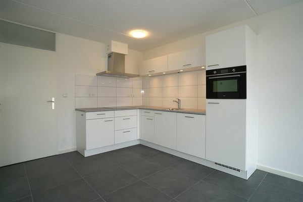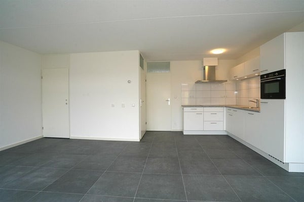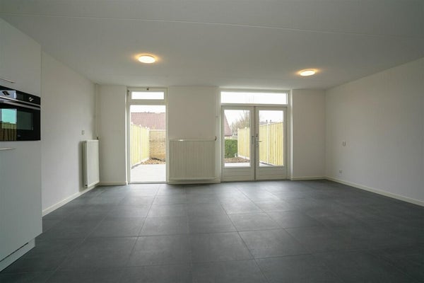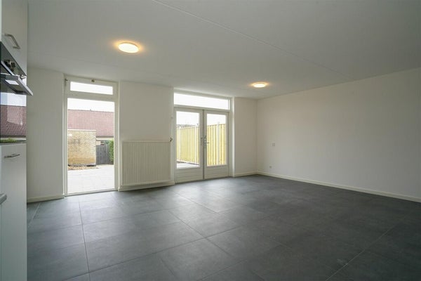 De tuingerichte woonkamer met open keuken is een lichte leefruimte met openslaande tuindeuren, een berging onder de trap en een aparte deur naar de tuin. Je hoeft geen vloer te leggen en niet te schilderen; je kunt direct het verhuisbedrijf inschakelen. De keuken heeft een moderne hoekopstelling met een inductiekookplaat, afzuigkap, vaatwasser, combimagnetron en een koelkast.